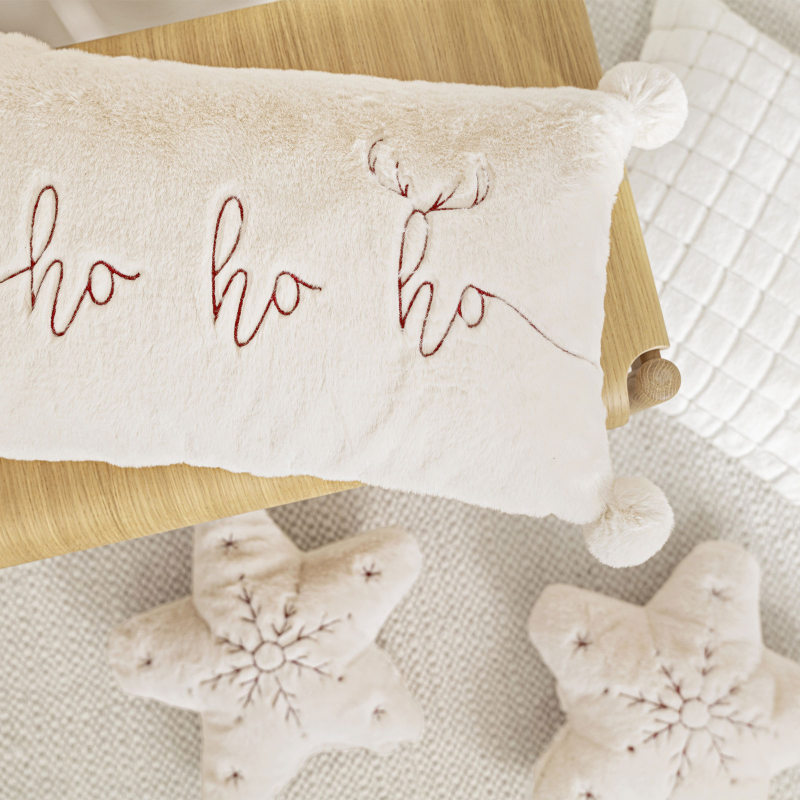 Das Kissen wurde mit dem Schriftzug "ho ho ho" im rotem Stick veredelt.